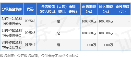 证券之星消息,4月29日财通证券资产管理有限公司发布《财通资管鸿利中短债债券型证券投资基金暂停大额申购、转换转入、定期定额投资业务公告》。公告中提示,为维护财通资管鸿利中短债债券型证券投资基金的稳定运作,保护基金份额持有人的利益,自2026年4月29日起财通资管鸿利中短债债券型证券投资基金暂停大额申购、转换转入、定期定额投资业务,申购、转换转入上限金额为1.0万元,下属分级基金调整明细如下:
