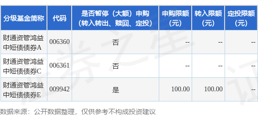 注:(1)根据法律法规和基金合同的相关规定,自2026年04月29日起,财通证券资产管理有限公司(以下简称“本公司”)将调整财通资管鸿益中短债债券型证券投资基金(以下简称“本基金”)E类份额在除本公司“直销渠道”以外的其他销售渠道的大额申购(含转换转入、定期定额投资)业务。届时起,若单日单个基金账户单个渠道的单笔申购(含转换转入、定期定额投资)金额超过人民币100元(不含)的,本公司将有权对超过100元的部分予以拒绝。若单日单个基金账户单个渠道的多笔累计申购(含转换转入、定期定额投资)金额超过人民币100元的,则对申请按照申请金额从大到小排序,逐笔累加至符合不超过人民币100元(含)限额的申请确认成功,对超过100元的部分及其余笔数本公司将有权予以拒绝。