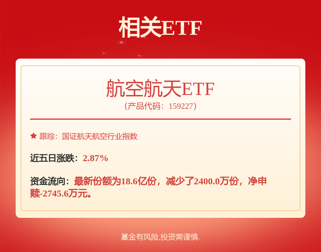 航空航天ETF(159227)紧密跟踪国证航天指数,申万一级军工行业占比高达98.2%,堪称全市场“军工纯度”最高的指数,覆盖航空装备、航天装备、卫星导航、新材料等关键产业链环节,成分股精选军工领域头部企业,涵盖大飞机研制、低空经济、商业航天等新兴领域,商业航天概念权重占比高达54%。