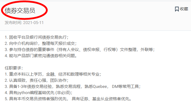 今年5月份,该公司曾发布一则债券交易员的社会招聘信息,工作职责包括:固收平台及银行间债券交易执行;向中介机构询价;参与持仓债券持有人会议、债权申报、行权等事宜。