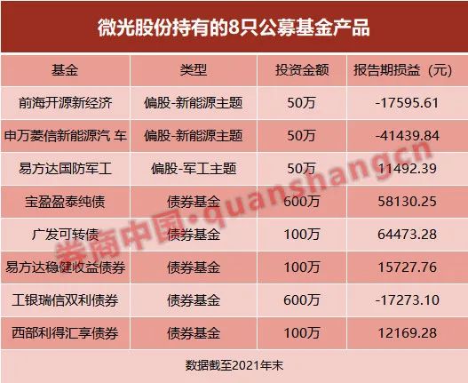 3月23日,身披新能源、军工两大概念的微光股份披露的年报显示,微光股份截至报告期末,共斥资1650万元持有8只公募基金产品,其中2只为新能源主题基金、1只为军工主题基金,具体为明星基金经理崔宸龙管理的前海开源新经济基金、申万菱信新能源汽车基金、易方达国防军工基金,上述3只偏股型基金的初始投资成本均为50万元。
