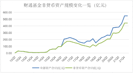 规模方面,财通基金管理规模也逐年攀升。Wind数据显示,截至2021年末,财通基金非货公募规模442.04亿元,排名当年上升6位、下半年上升7位、四季度上升8位。