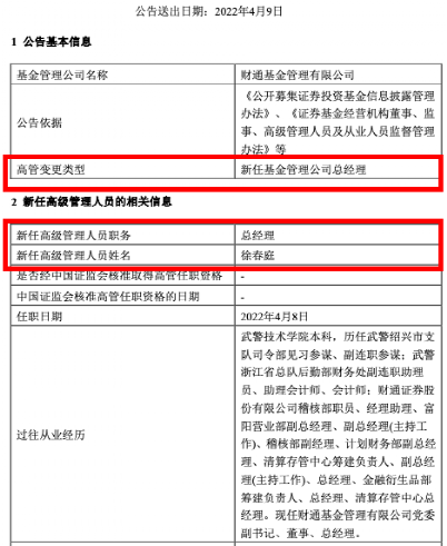 4月9日,财通基金发布公告称,徐春庭出任公司总经理职务。