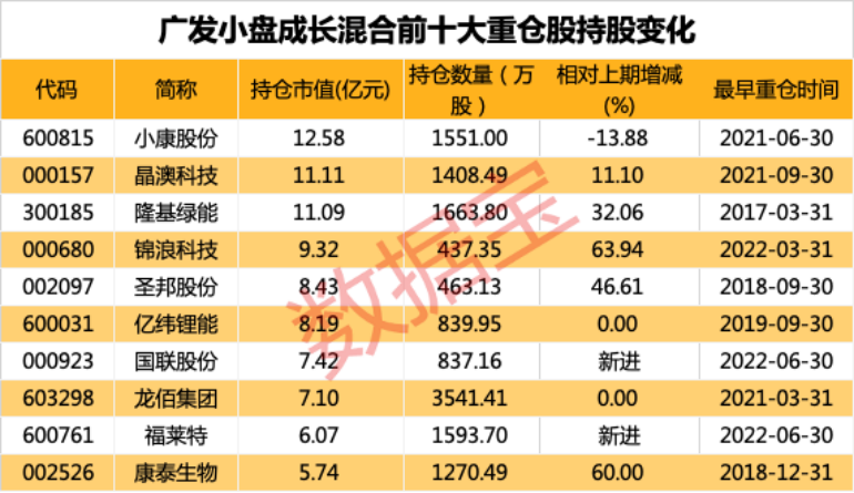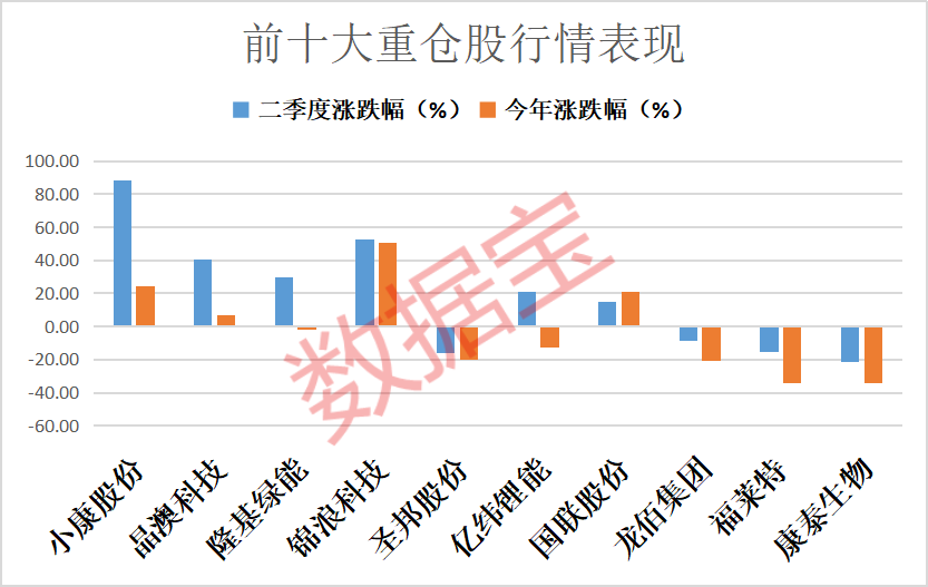 证券时报·数据宝统计,前十大重仓股当中,亿纬锂能、龙佰集团的持仓数量不变,国联股份、福莱特分别新进成为第七大重仓股和第九大重仓股,持股数分别为837.16万股和1593.7万股。增持股方面,晶澳科技、隆基绿能、锦浪科技、圣邦股份、康泰生物的持股数量均较一季度末有所增长。