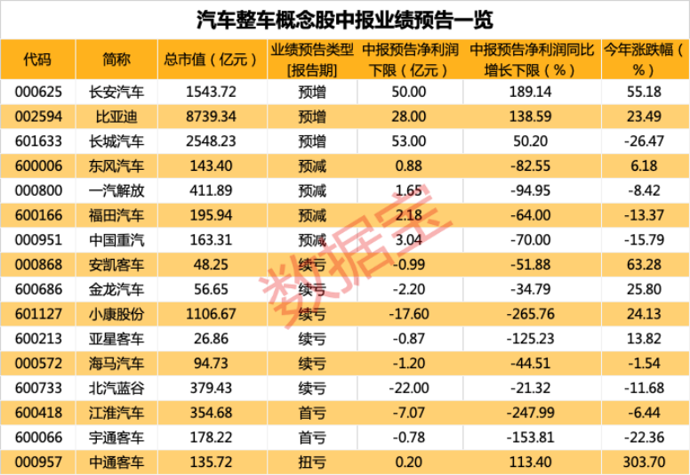 根据证券时报·数据宝统计,目前23家汽车整车概念股中,有16家发布了中报业绩预告,仅比亚迪、长安汽车、长城汽车三家车企业绩预增,中通客车业绩扭亏,其余上市公司的业绩均受销量滑坡、原材料成本上升等因素影响净利润有不同幅度的下滑甚至江淮汽车和宇通客车录得首亏。整体来看业绩表现不佳。