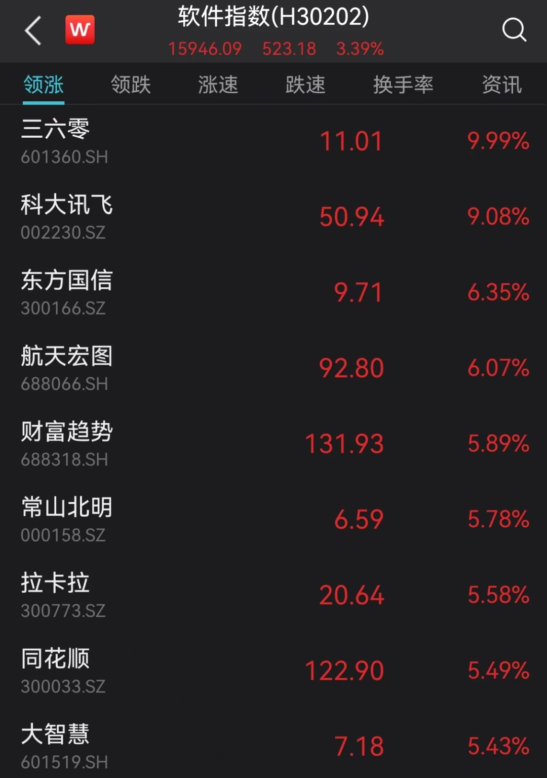 在通信板块带动下,涵盖数字经济、信创等主题在内的中证全指软件指数(H30202)大涨3.39%,三六零、东方国信等个股均涨逾6%。