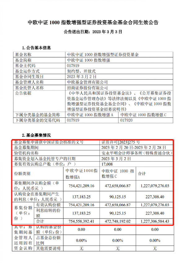 3月3日,中欧基金公告称,中欧中证1000指数增强基金宣布成立,2月20日至2月28日募集期间净认购金额达到12.27亿元,有效认购总户数17008户。