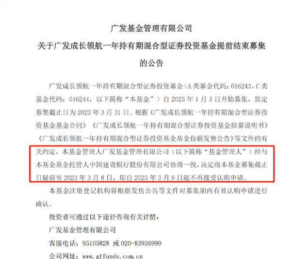 广发基金就宣布,广发成长领航一年持有期混合型基金自2023年1月3日开始募集,原定募集截止日为2023年3月31日。根据有关约定,决定将该基金募集截止日提前至2023年3月8日,即自2023年3月9日起不再接受认购申请。