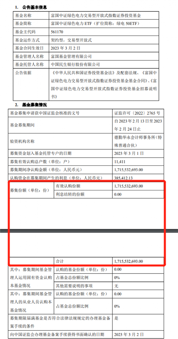 3月2日,富国基金也发布公告,富国中证绿色电力ETF宣布成立,2月13日至2月24日募集期间净认购金额达到17.16亿元,有效认购总户数11411户。