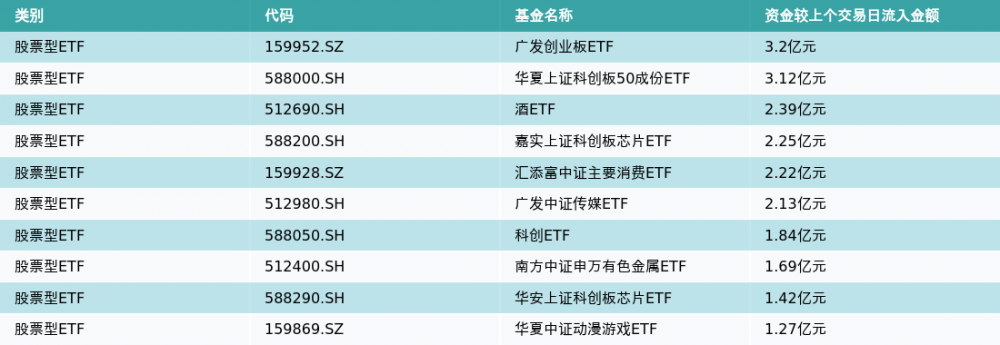 3、股票型ETF资金流向昨日股票型ETF资金流入最多的3支ETF及其流入金额分别为:广发创业板ETF(流入3.2亿元)、华夏上证科创板50成份ETF(流入3.12亿元)、酒ETF(流入2.39亿元)。资金流入前10详情见下表: