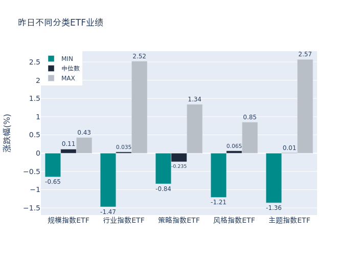 昨日股票型ETF收益率中位数为0.04%。其中按照不同分类,规模指数中1000增强ETF天弘收益率最高,为0.43%;行业指数中建信中证饮料主题ETF收益率最高,为2.52%;策略指数中华夏中证红利质量ETF收益率最高,为1.34%;风格指数中华夏创成长ETF收益率最高,为0.85%;主题指数中酒ETF收益率最高,为2.57%。