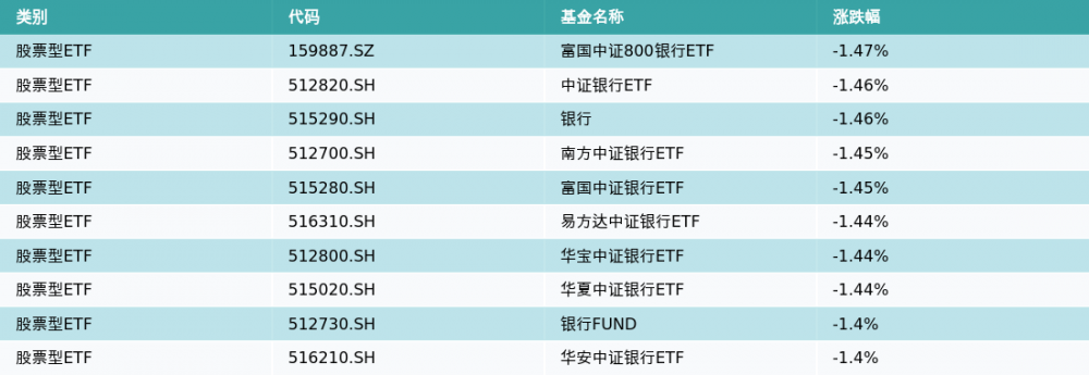 昨日股票型ETF跌幅最大的3支ETF及其收益率分别为:富国中证800银行ETF(-1.47%)、中证银行ETF(-1.46%)、银行(-1.46%)。跌幅前10详情见下表: