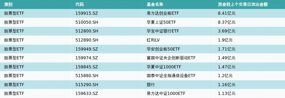 昨日股票型ETF资金流出最多的3支ETF及其流入金额分别为:易方达创业板ETF(流出8.41亿元)、华夏上证50ETF(流出8.37亿元)、华宝中证银行ETF(流出3.69亿元)。资金流出前10详情见下表: