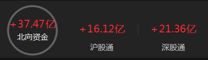 北向资金全天净买入37.47亿元,连续3日净买入;其中沪股通净买入16.12亿元,深股通净买入21.36亿元。