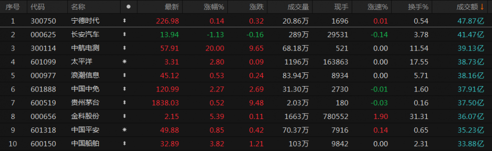 个股方面,宁德时代成交额居首,为47.87亿元,长安汽车、中航电测、太平洋、浪潮信息、中国中免等成交额靠前,分别为41.47亿元、39.13亿元、38.73亿元、38.16亿元、37.91亿元。
