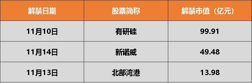 具体来看,有研硅在11月10日将解禁7.40亿股,为首发原股东限售股份;新诺威、北部湾港将分别在11月14日及11月13日解禁1.58亿股与1.56亿股,均为定向增发机构配售股份。