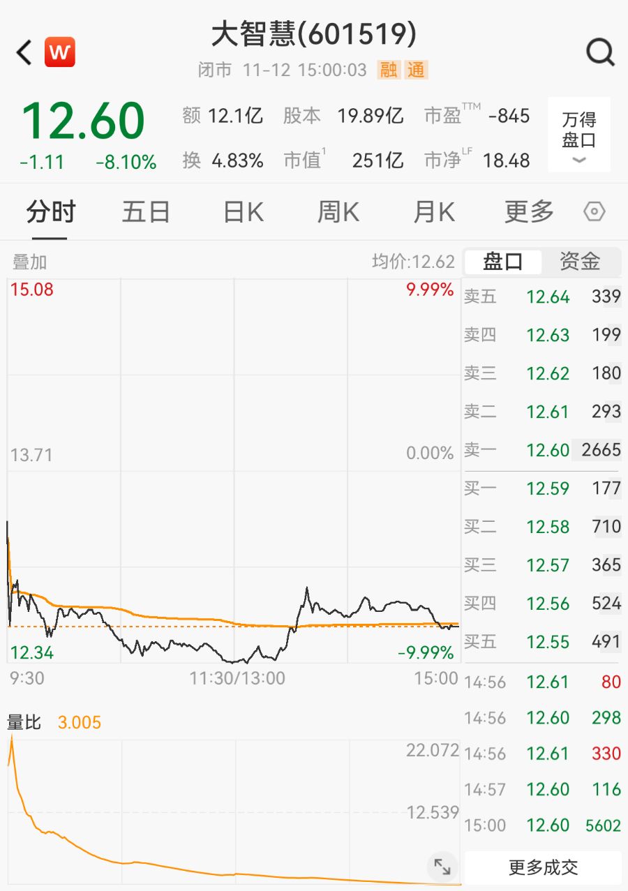 11月12日,大智慧(601519.SH)股价大幅下挫,盘中一度跌停,报收12.60元/股,总市值为250.6亿元。