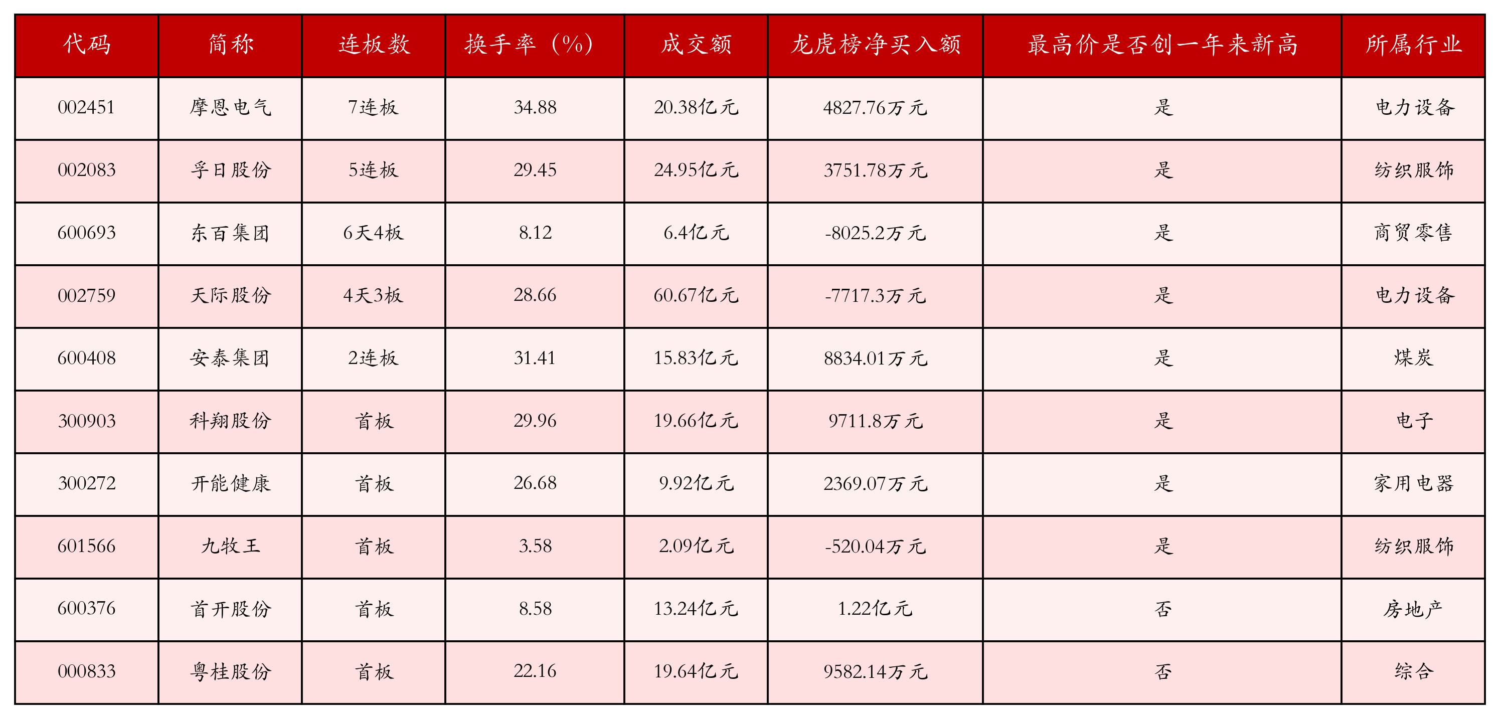 截至11月12日收盘,上证综指下跌0.07%,收于4000.14点,深证成指下跌0.36%,收于13240.62点,创业板指下跌0.39%,收于3122.03点。今日沪深两市A股共计77只涨停,综合当前连板数以及当日龙虎榜数据,其中较为强势的前三只个股分别为:摩恩电气(002451)、孚日股份(002083)与东百集团(600693)。今日强势个股前10位具体数据见下表: