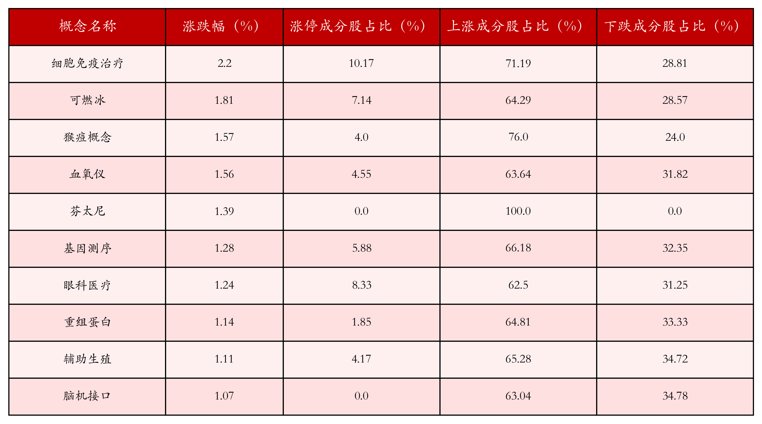根据A股概念涨跌幅与所对应的股票池综合分析,涨幅靠前的三个概念板块分别为:细胞免疫治疗、可燃冰与猴痘概念。排名前10位的概念板块相关数据见下表: