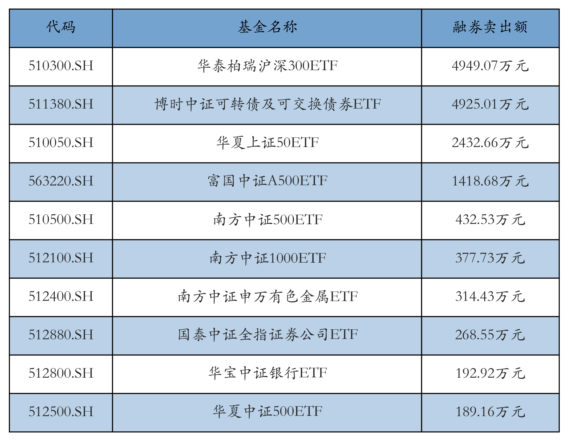 11月12日ETF融券卖出额前三位分别为:华泰柏瑞沪深300ETF(4949.07万元)、博时中证可转债及可交换债券ETF(4925.01万元)和华夏上证50ETF(2432.66万元),前10具体见下表: