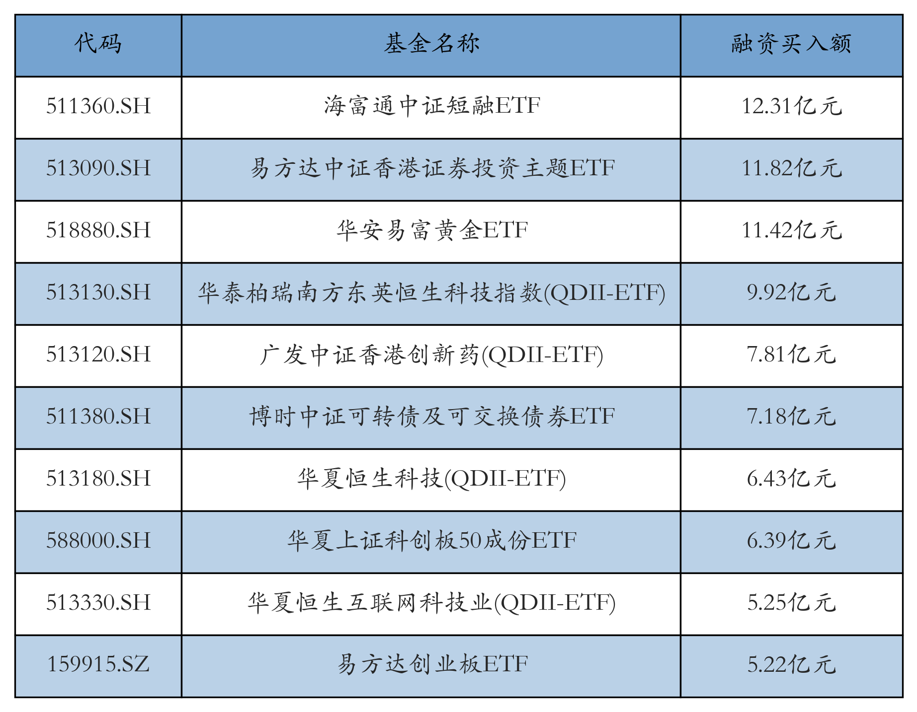 11月12日ETF融资买入额前三位分别为:海富通中证短融ETF(12.31亿元)、易方达中证香港证券投资主题ETF(11.82亿元)和华安易富黄金ETF(11.42亿元),前10具体见下表: