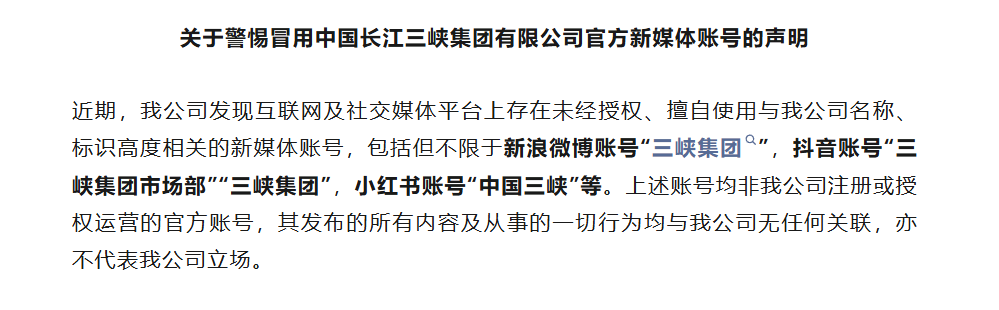 (原标题:三峡集团声明:这些账号属冒用,立即注销)