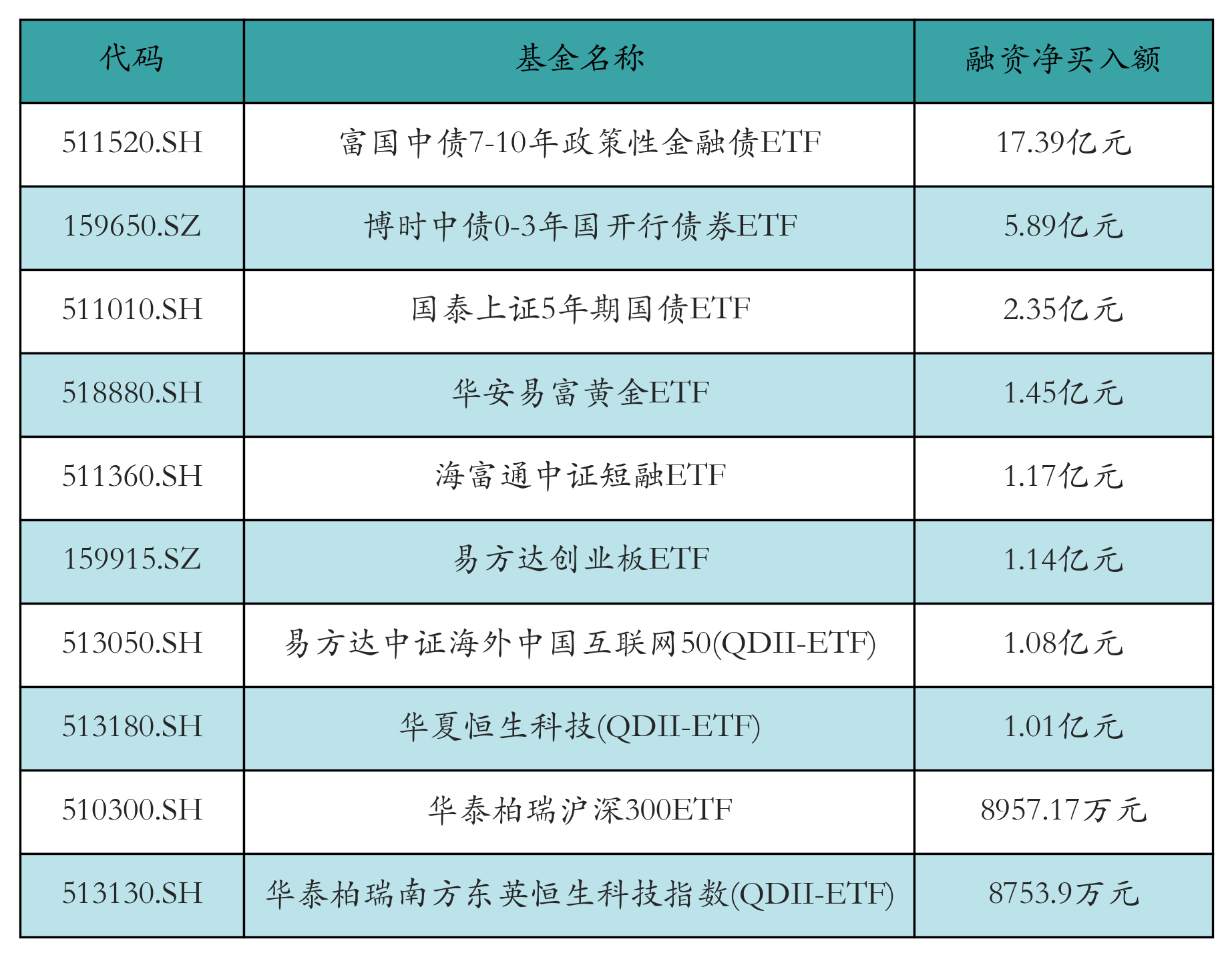 11月18日ETF融资净买入额前三位分别为:富国中债7-10年政策性金融债ETF(17.39亿元)、博时中债0-3年国开行债券ETF(5.89亿元)和国泰上证5年期国债ETF(2.35亿元),前10具体见下表: