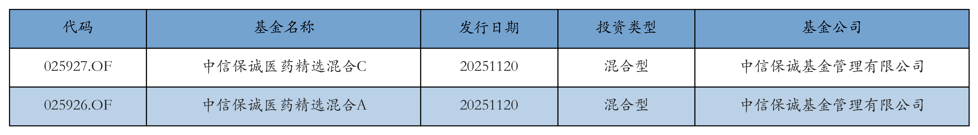 昨日有2只新基金发行,分别为:中信保诚医药精选混合C、中信保诚医药精选混合A,详情见下表: