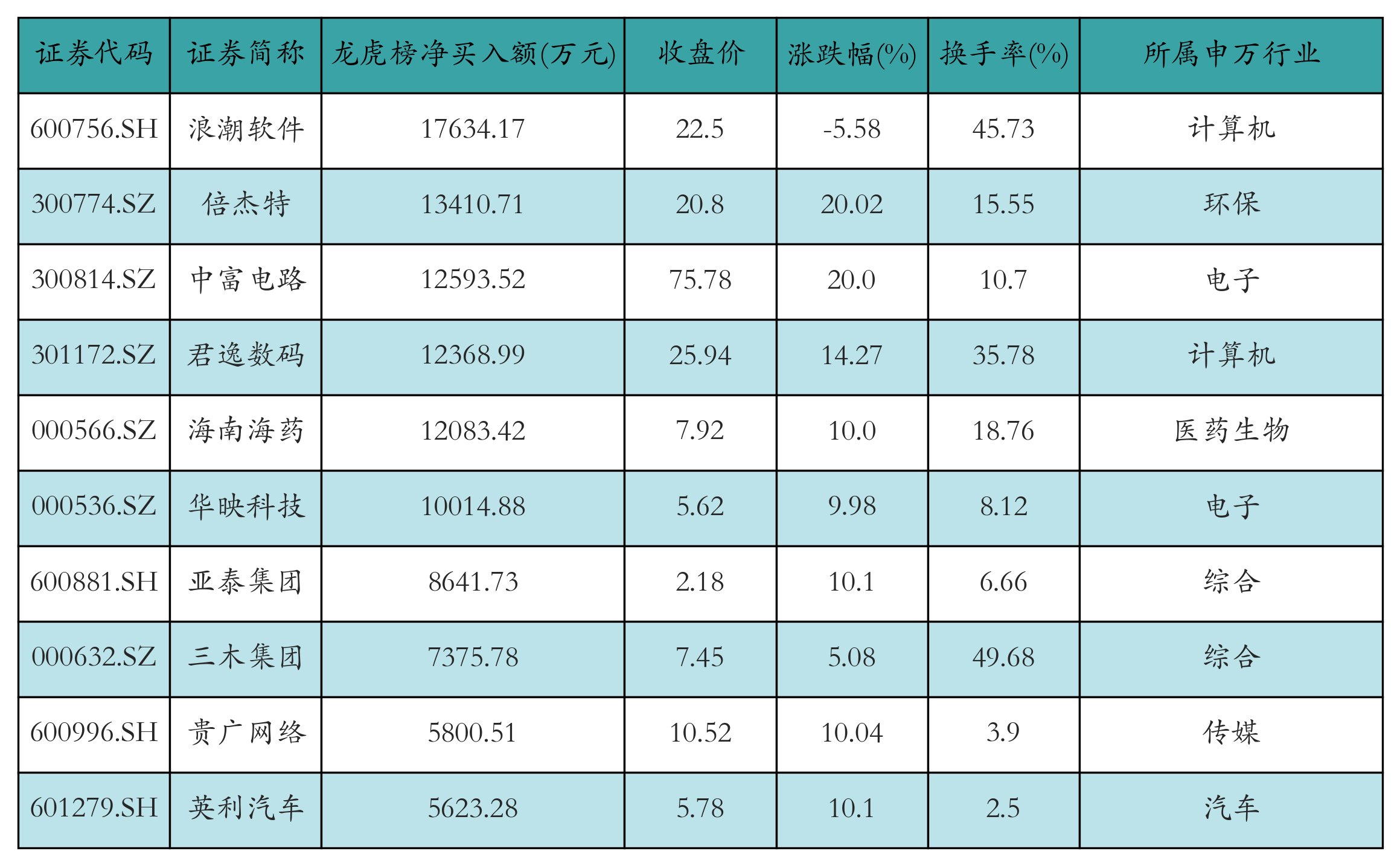 昨日龙虎榜营业部净买入额前10详情见下表: