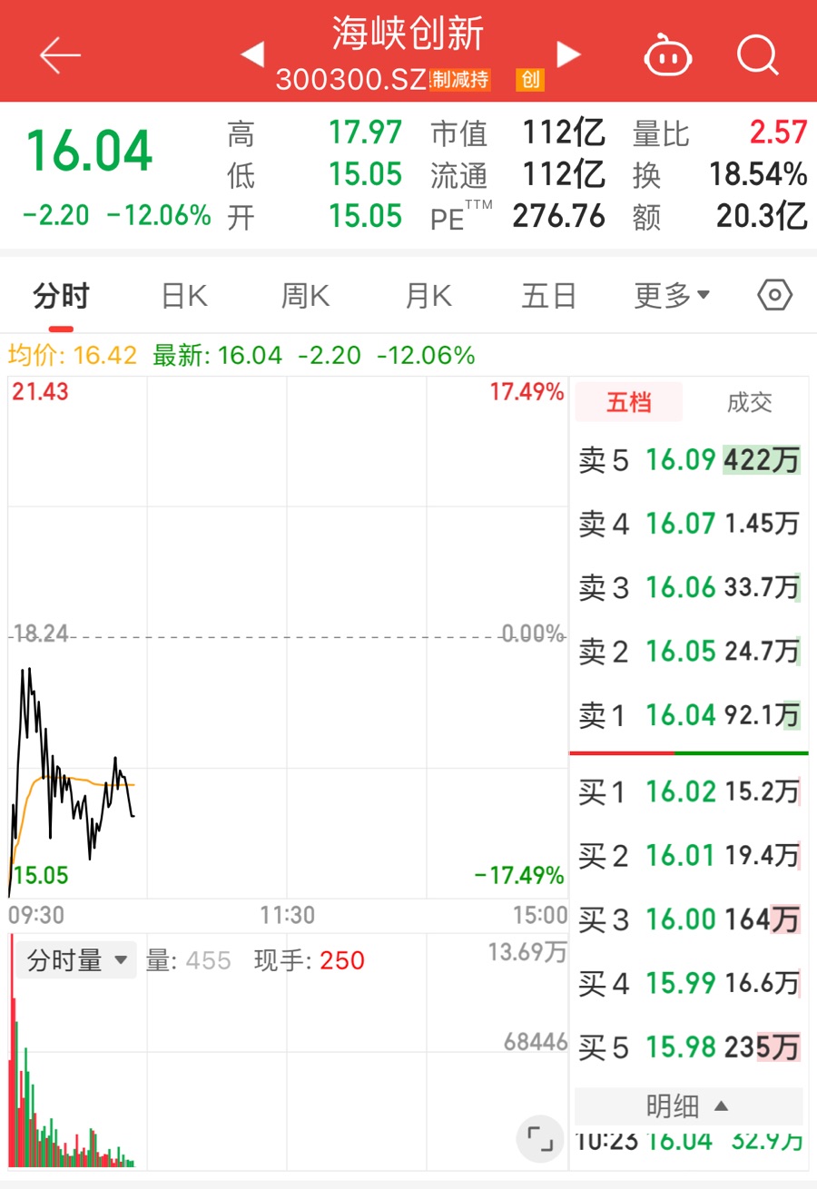 复牌首日,两只股票即上演“过山车”式起伏。其中,海峡创新以低开17.49%开盘,平潭发展则微跌0.58%起步,而后迅速进入震荡模式:平潭发展盘中一度翻红走强,海峡创新的跌幅也快速收窄至2.25%左右;但截至10时22分,股价再度回调,平潭发展报11.88元/股,跌幅0.75%,海峡创新报16.04元/股,跌幅扩大至12.06%。