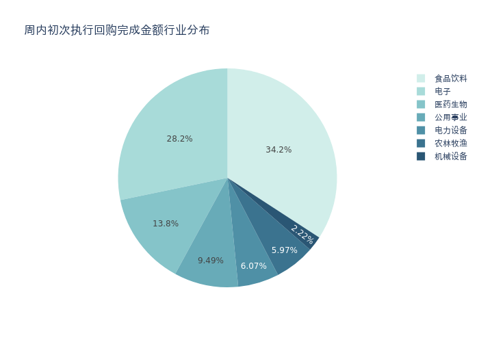 按照初次执行金额所在不同行业分布,金额最高的3个行业分别为:食品饮料、电子、医药生物,详情见下图:
