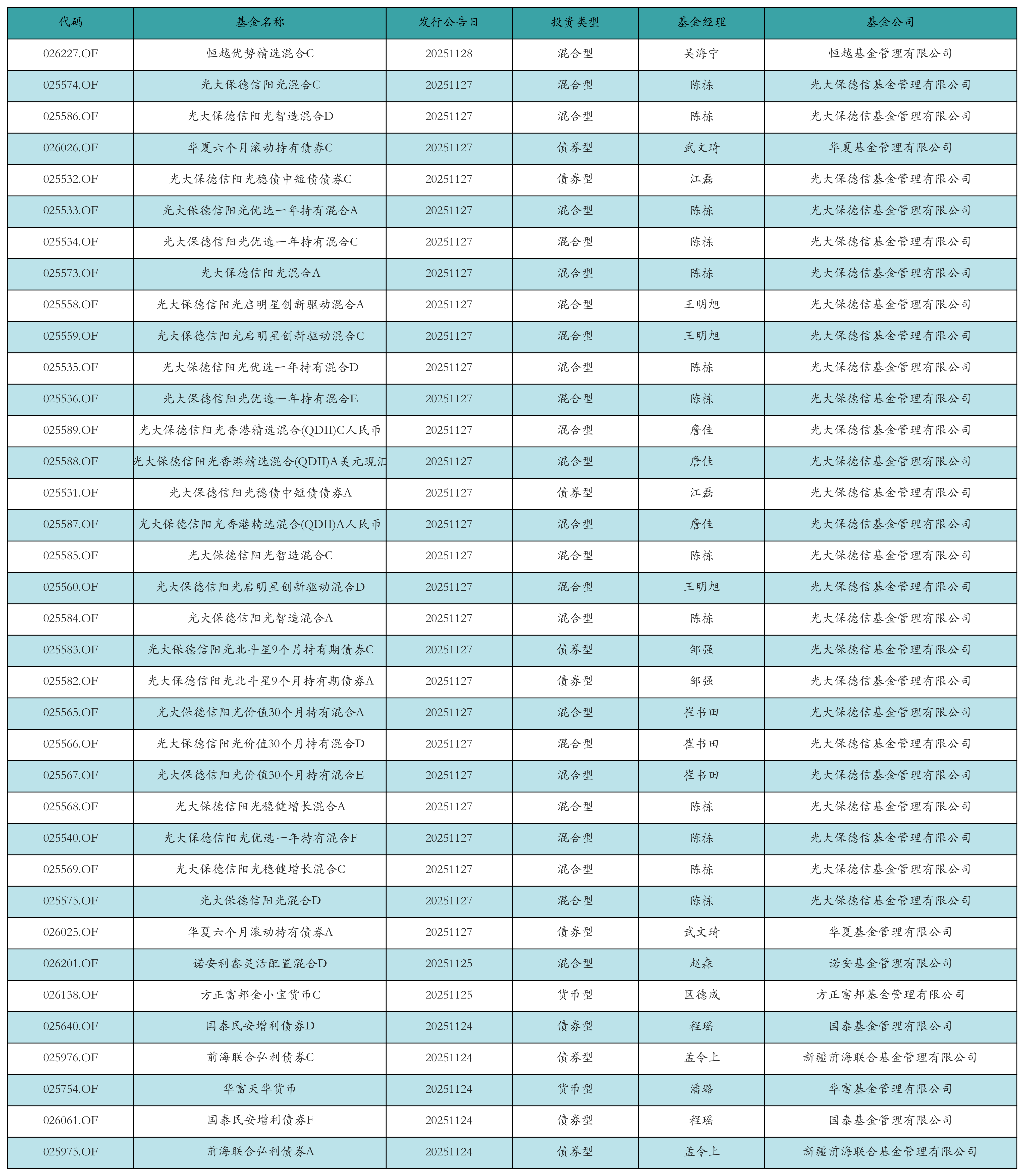 上周有36只新基金发行,分别为:恒越优势精选混合C、光大保德信阳光混合C、光大保德信阳光智造混合D、华夏六个月滚动持有债券C、光大保德信阳光稳债中短债债券C、光大保德信阳光优选一年持有混合A、光大保德信阳光优选一年持有混合C、光大保德信阳光混合A、光大保德信阳光启明星创新驱动混合A、光大保德信阳光启明星创新驱动混合C、光大保德信阳光优选一年持有混合D、光大保德信阳光优选一年持有混合E、光大保德信阳光香港精选混合(QDII)C人民币、光大保德信阳光香港精选混合(QDII)A美元现汇、光大保德信阳光稳债中短债债券A、光大保德信阳光香港精选混合(QDII)A人民币、光大保德信阳光智造混合C、光大保德信阳光启明星创新驱动混合D、光大保德信阳光智造混合A、光大保德信阳光北斗星9个月持有期债券C、光大保德信阳光北斗星9个月持有期债券A、光大保德信阳光价值30个月持有混合A、光大保德信阳光价值30个月持有混合D、光大保德信阳光价值30个月持有混合E、光大保德信阳光稳健增长混合A、光大保德信阳光优选一年持有混合F、光大保德信阳光稳健增长混合C、光大保德信阳光混合D、华夏六个月滚动持有债券A、诺安利鑫灵活配置混合D、方正富邦金小宝货币C、国泰民安增利债券D、前海联合弘利债券C、华富天华货币、国泰民安增利债券F、前海联合弘利债券A,详情见下表: