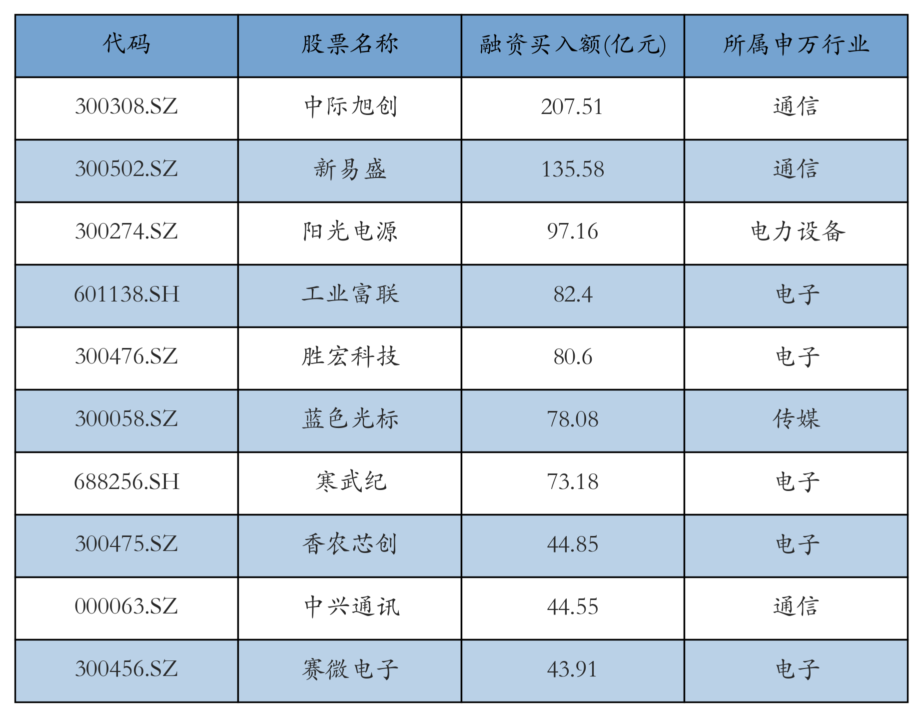 上周两市共有3460只个股有融资资金买入,共有134只个股买入金额超10亿元,其中中际旭创、新易盛、阳光电源排名前三,买入金额分别207.51亿元、135.58亿元、97.16亿元。融资买入额前10个股详情见下表: