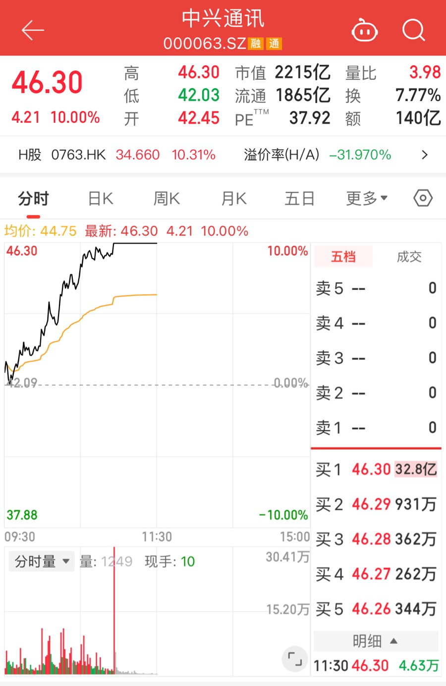 值得注意的是,该消息发酵后,中兴通讯(000063.SZ/0763.HK)股价出现显著波动。截至午盘,中兴通讯A股强封板涨停,成交额超140亿元。港股同步走强,盘中一度涨超10%。