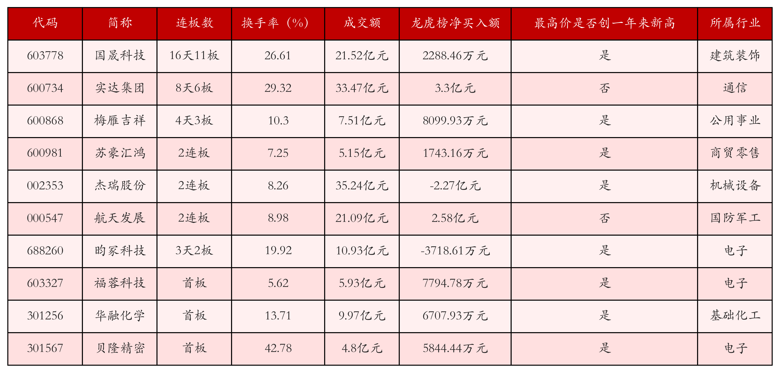 截至12月1日收盘,上证综指上涨0.65%,收于3914.01点,深证成指上涨1.25%,收于13146.72点,创业板指上涨1.31%,收于3092.5点。今日沪深两市A股共计75只涨停,综合当前连板数以及当日龙虎榜数据,其中较为强势的前三只个股分别为:国晟科技(603778)、实达集团(600734)与梅雁吉祥(600868)。今日强势个股前10位具体数据见下表: