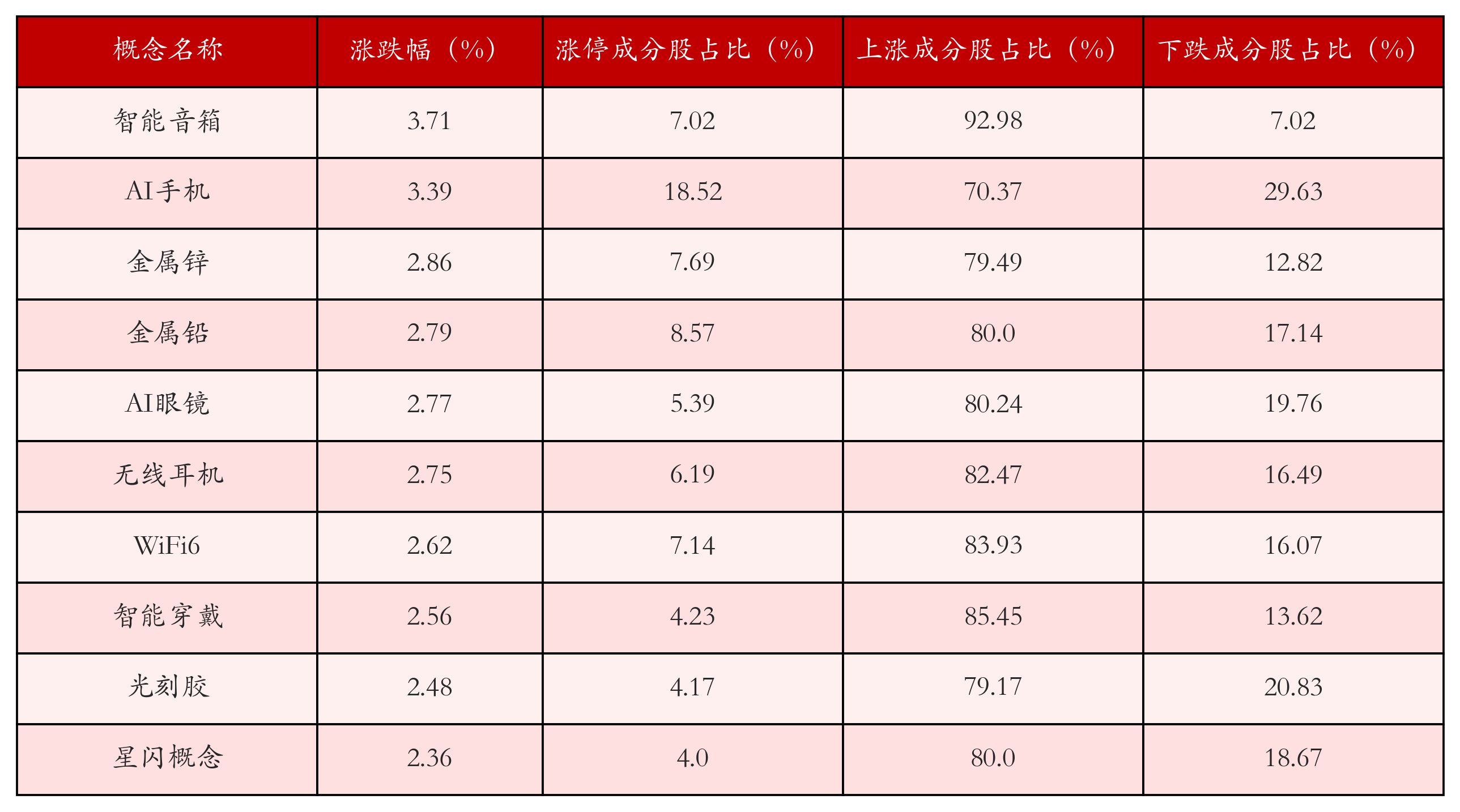 根据A股概念涨跌幅与所对应的股票池综合分析,涨幅靠前的三个概念板块分别为:智能音箱、AI手机与金属锌。排名前10位的概念板块相关数据见下表: