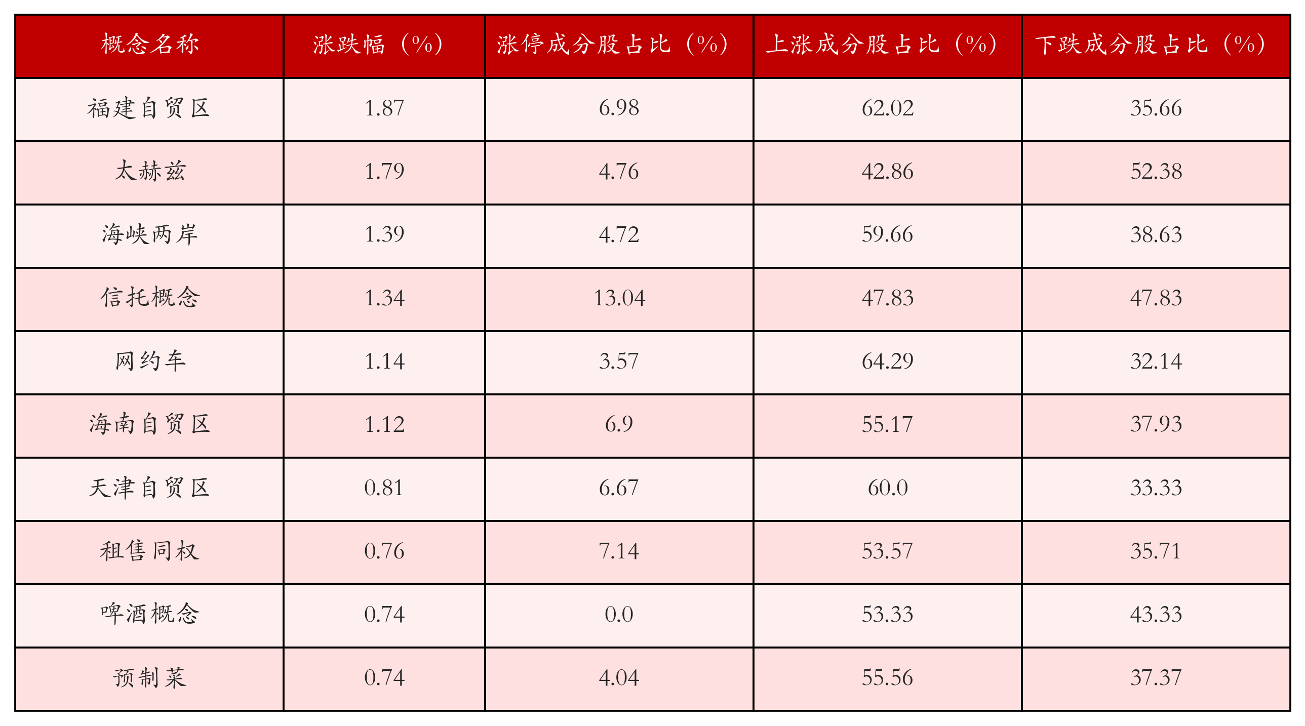 根据A股概念涨跌幅与所对应的股票池综合分析,涨幅靠前的三个概念板块分别为:福建自贸区、太赫兹与海峡两岸。排名前10位的概念板块相关数据见下表: