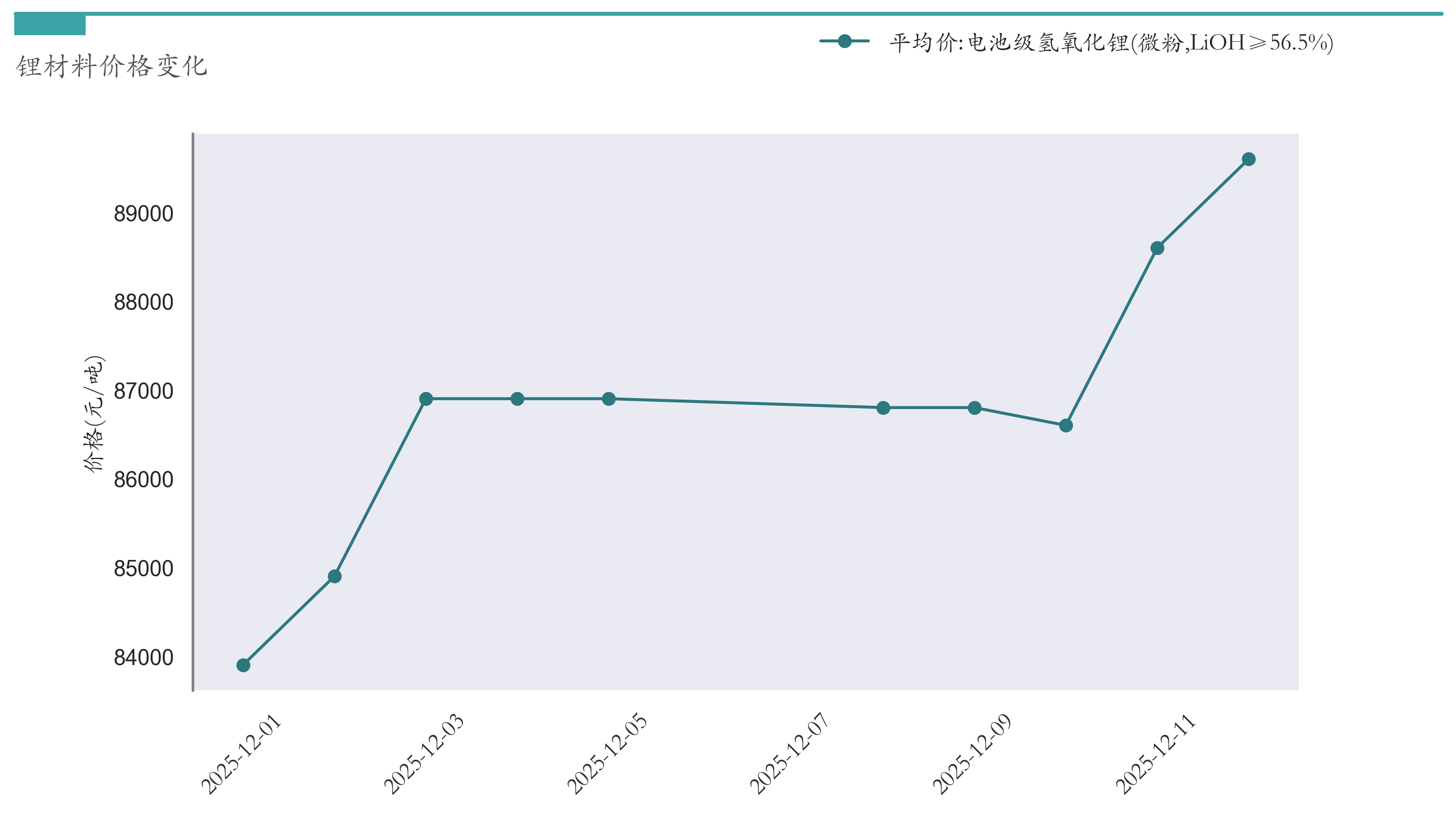 截至12月12日,电池级氢氧化锂平均报价为89600元/吨,较12月5日上涨2700元/吨。近两周氢氧化锂价格变化如下图所示: