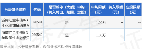 注:自2024年9月19日起,对浙商汇金中债0-3年政策性金融债指数证券投资基金(以下简称“本基金”)的大额申购业务进行限制,单个账户每一开放日申购不得超过1万元(不含1万元)。如单日单个基金账户单笔申购本基金的金额超过1万元(不含),则1万元确认申购成功,超过1万元(不含)的部分将确认失败。本基金恢复大额申购业务的具体时间将另行公告。