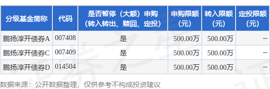 证券之星消息,9月19日鹏扬基金管理有限公司发布《鹏扬淳开债券型证券投资基金暂停大额申购(含转换转入、定期定额投资)业务的公告》。公告中提示,为保证本基金的平稳运作,保护基金份额持有人利益,自2024年9月19日起鹏扬淳开债券型证券投资基金暂停大额申购(含转换转入、定期定额投资)业务,申购、转换转入上限金额为500.0万元,下属分级基金调整明细如下: