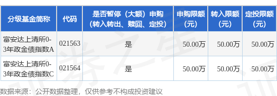证券之星消息,9月25日富安达基金管理有限公司发布《富安达上海清算所0-3年政策性金融债指数证券投资基金国庆节前暂停大额申购(转换转入、定期定额投资)的公告》。公告中提示,为保护基金份额持有人的利益,根据《富安达上海清算所0-3年政策性金融债指数证券投资基金基金合同》的有关规定,自2024年9月26日起富安达上海清算所0-3年政策性金融债指数证券投资基金国庆节前暂停大额申购(转换转入、定期定额投资),申购、转换转入、定投上限金额为50.0万元,下属分级基金调整明细如下: