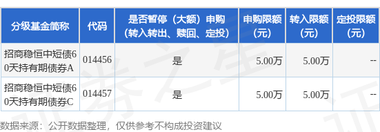 证券之星消息,9月25日招商基金管理有限公司发布《关于暂停招商稳恒中短债60天持有期债券型证券投资基金大额申购(含定期定额投资)和转换转入业务的公告》。公告中提示,为保障基金的平稳运作,维护基金份额持有人利益,自2024年9月30日起暂停招商稳恒中短债60天持有期债券型证券投资基金大额申购(含定期定额投资)和转换转入业务,申购、转换转入上限金额为5.0万元,下属分级基金调整明细如下: