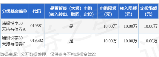 证券之星消息,9月25日浦银安盛基金管理有限公司发布《关于浦银安盛悦享30天持有期债券型证券投资基金于2024年国庆节假期前暂停通过部分销售机构的大额申购、转换转入及定期定额投资业务的公告》。公告中提示,为保护基金份额持有人的利益,加强基金投资运作的稳定性,自2024年9月27日起浦银安盛悦享30天持有期债券型证券投资基金于2024年国庆节假期前暂停通过部分销售机构的大额申购、转换转入及定期定额投资业务,下属分级基金调整明细如下: