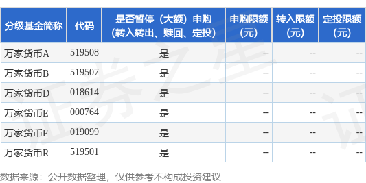 证券之星消息,9月25日万家基金管理有限公司发布《关于万家货币市场证券投资基金2024年国庆假期前暂停申购(含转换转入、定期定额投资)业务的公告》。公告中提示,为保护基金份额持有人的利益,自2024年9月27日起万家货币市场证券投资基金2024年国庆假期前暂停申购(含转换转入、定期定额投资)业务,下属分级基金调整明细如下: