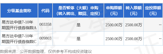 注:(1)根据法律法规和基金合同的相关规定,易方达基金管理有限公司(以下简称“本公司”)决定自2024年9月30日起暂停易方达中债7-10年期国开行债券指数证券投资基金(以下简称“本基金”)机构客户在全部销售机构A类基金份额和C类基金份额的大额申购、大额转换转入业务,单日单个基金账户在全部销售机构累计申购(含定期定额投资及转换转入,下同)本基金A类基金份额或C类基金份额的金额不超过2500万元(含)。如单日单个基金账户单笔申购本基金A类基金份额或C类基金份额的金额超过2500万元(不含),则2500万元确认申购成功,超过2500万元(不含)金额的部分将确认失败;如单日单个基金账户多笔累计申购本基金A类基金份额的金额超过2500万元(不含)或单日单个基金账户多笔累计申购本基金C类基金份额的金额超过2500万元(不含),则对该类基金份额的申请按照申请金额从大到小排序,基金管理人将逐笔累加至该类基金份额不超过2500万元(含)限额的申请确认成功,该类基金份额其余申请金额确认失败。