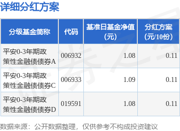 证券之星消息,9月25日发布《平安0-3年期政策性金融债债券型证券投资基金分红公告》。2024年度第3次。公告显示,本次分红的收益分配基准日为9月9日,详细分红方案如下: