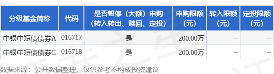 证券之星消息,9月27日中银基金管理有限公司发布《关于中银中短债债券型证券投资基金暂停大额申购及定期定额投资业务的公告》。公告中提示,为保护基金份额持有人利益,自2024年9月27日起中银中短债债券型证券投资基金暂停大额申购及定期定额投资业务,申购上限金额为200.0万元,下属分级基金调整明细如下: