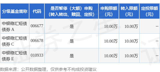 证券之星消息,9月27日中银基金管理有限公司发布《关于中银稳汇短债债券型证券投资基金暂停大额申购、转换转入及定期定额投资业务的公告》。公告中提示,为保护基金份额持有人利益,自2024年9月27日起中银稳汇短债债券型证券投资基金暂停大额申购、转换转入及定期定额投资业务,申购、转换转入上限金额为10.0万元,下属分级基金调整明细如下: