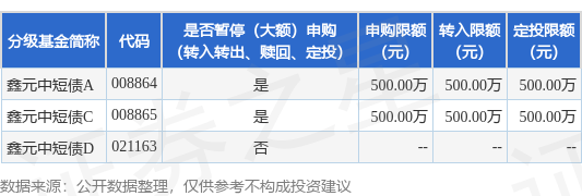 证券之星消息,9月30日鑫元基金管理有限公司发布《关于鑫元中短债债券型证券投资基金A、C类份额暂停大额申购(转换转入、定期定额投资)业务的公告》。公告中提示,为保护个人投资者利益,自2024年9月30日起鑫元中短债债券型证券投资基金A、C类份额暂停大额申购(转换转入、定期定额投资)业务,申购、转换转入上限金额为500.0万元,下属分级基金调整明细如下: