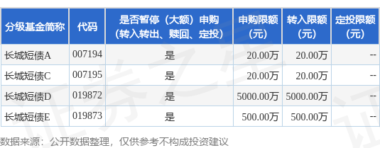 证券之星消息,9月30日长城基金管理有限公司发布《长城短债债券型证券投资基金调整申购、转换转入、定期定额投资业务限额的公告》。公告中提示,为保证基金的稳定运作,保护基金份额持有人利益,自2024年10月8日起长城短债债券型证券投资基金调整申购、转换转入、定期定额投资业务限额,下属分级基金调整明细如下: